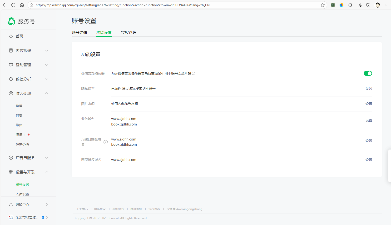 ⑤公众号后台“业务域名”、“JS接口安全域名”,“网页授权域名”均配置了:“https://www.zjdhh.com”域名