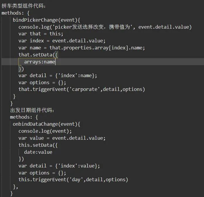 <view class="section"><picker bindchange="bindPickerChange" value="{{index}}" range="{{array}}"><view class="section-picker"><view class="picker">{{arrays}}</view><icon class="icon"></icon></view></picker></view><view class="carpool-group"><view class="carpool-title">拼车类型</view><selector name="carpool" array="{{carpool}}" arrays="{{carpools}}" bindcarporate="onCarporateEvent"></selector></view>