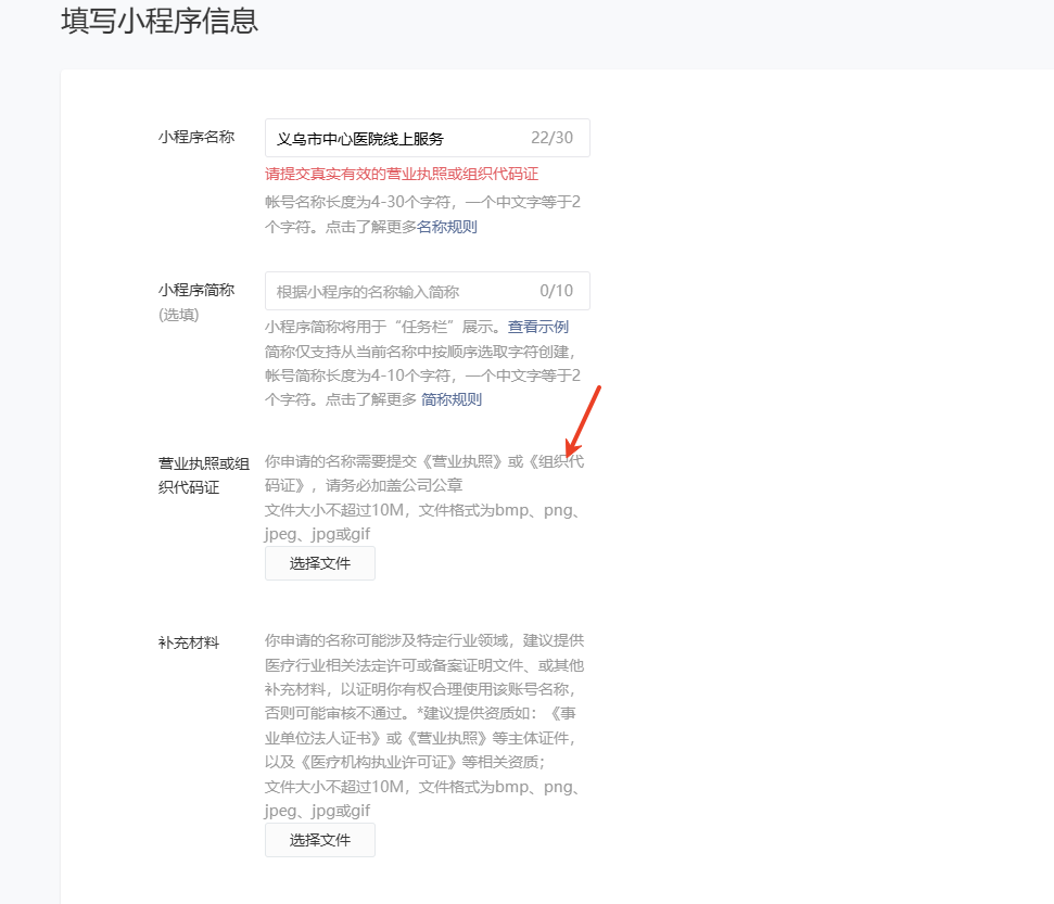 目前医院没有营业执照和组织代码证,这里提交什么?