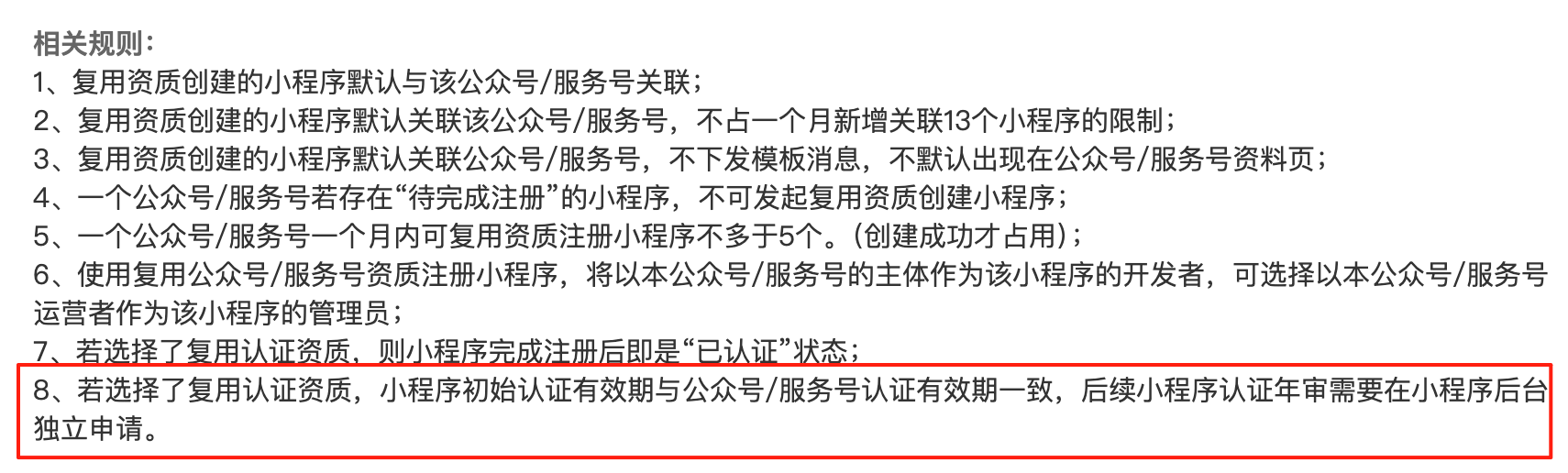 若选择了复用认证资质,小程序初始认证有效期与公众号/服务号认证有效期一致,后续小程序认证年审需要在小程序后台独立申请。https://developers.weixin.qq.com/community/develop/doc/0008065a6c42e8102ba912eeb50809