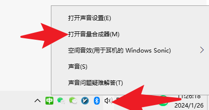 右击音量,打开音量合成器。