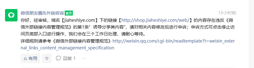您好,域名http://shop.jiaheshiye.com/web/,在腾讯云注册并备案通过,服务器也在腾讯云,浏览器访问正常,2月5号帮我解除了现在又出现,微信访问网站出现“无法确认该网页的安全性,请谨慎访问”,2月12你们说内容存在违反《微信外部链接内容管理规范》的第1条“ 诱导分享类内容”,但我们的内容并没有要求分享才可以查看,也没有要求客户分享,我们只是做了需登录才可以查看的要求,请核实后帮忙解除拦截。这是第二次被拦截,重复被拦截的原因是什么,望告之,是否还会再出现,谢谢!