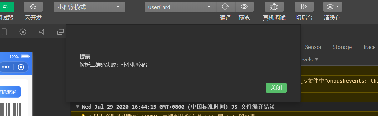 遇到了同样的问题,后台已经配置了扫普通二维码,并且通过手机扫描普通二维码可以打开小程序,但是使用微信开发者工具 二维码编译,无法打开小程序, 提示解析失败:非小程序码, 请问如何解决?