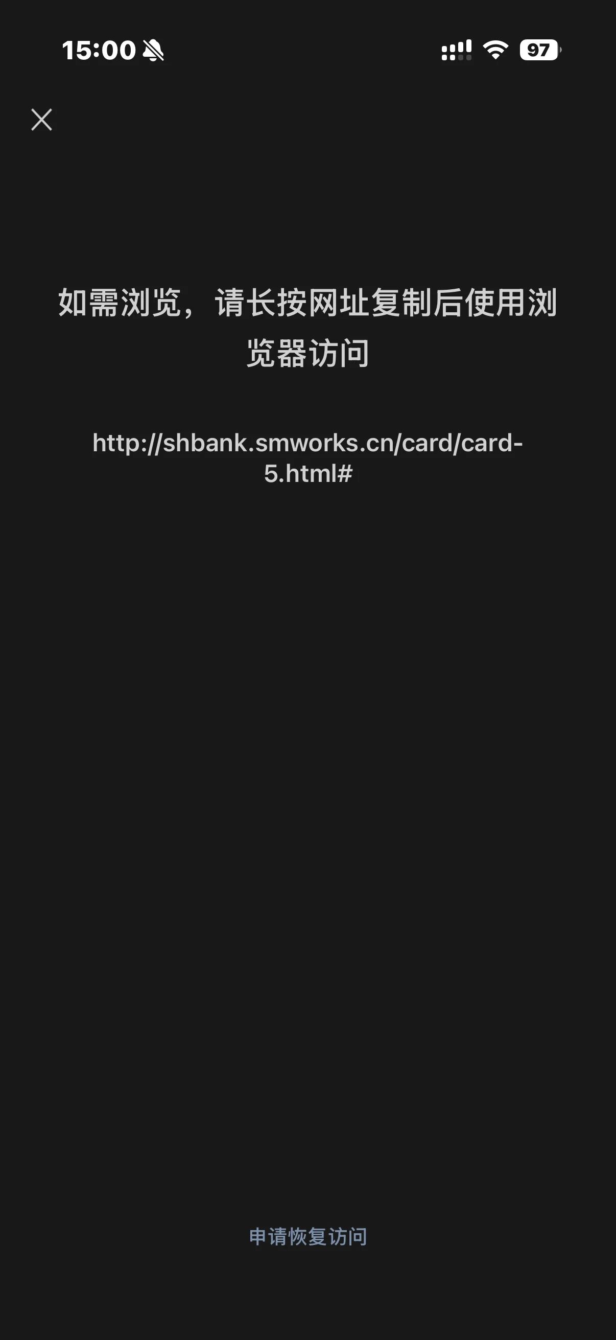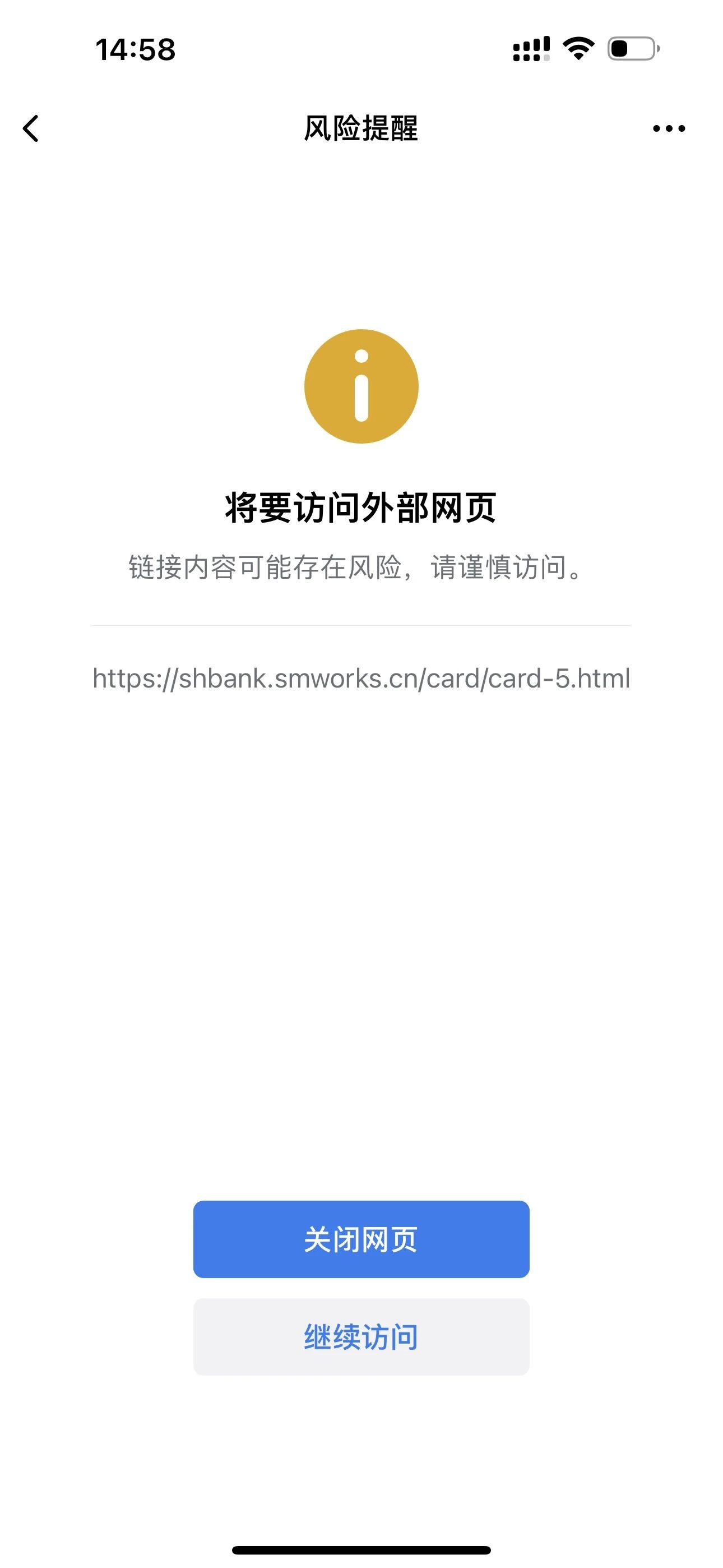 你好,经审核,域名【smworks.cn】下的链接【http://shbank.smworks.cn/card/card-1.html#】的内容存在违反《微信外部链接内容管理规范》的第2.6条“欺诈类内容”,请排查并把域名下相关违规内容修改并修复安全漏洞后进行申诉;申诉方式可点击停止访问页底部入口进行操作,我们会在三个工作日处理,请耐心等待。 详细规则请参考《微信外部链接内容管理规范》http://weixin.qq.com/cgi-bin/readtemplate?t=weixin_external_links_content_management_specification