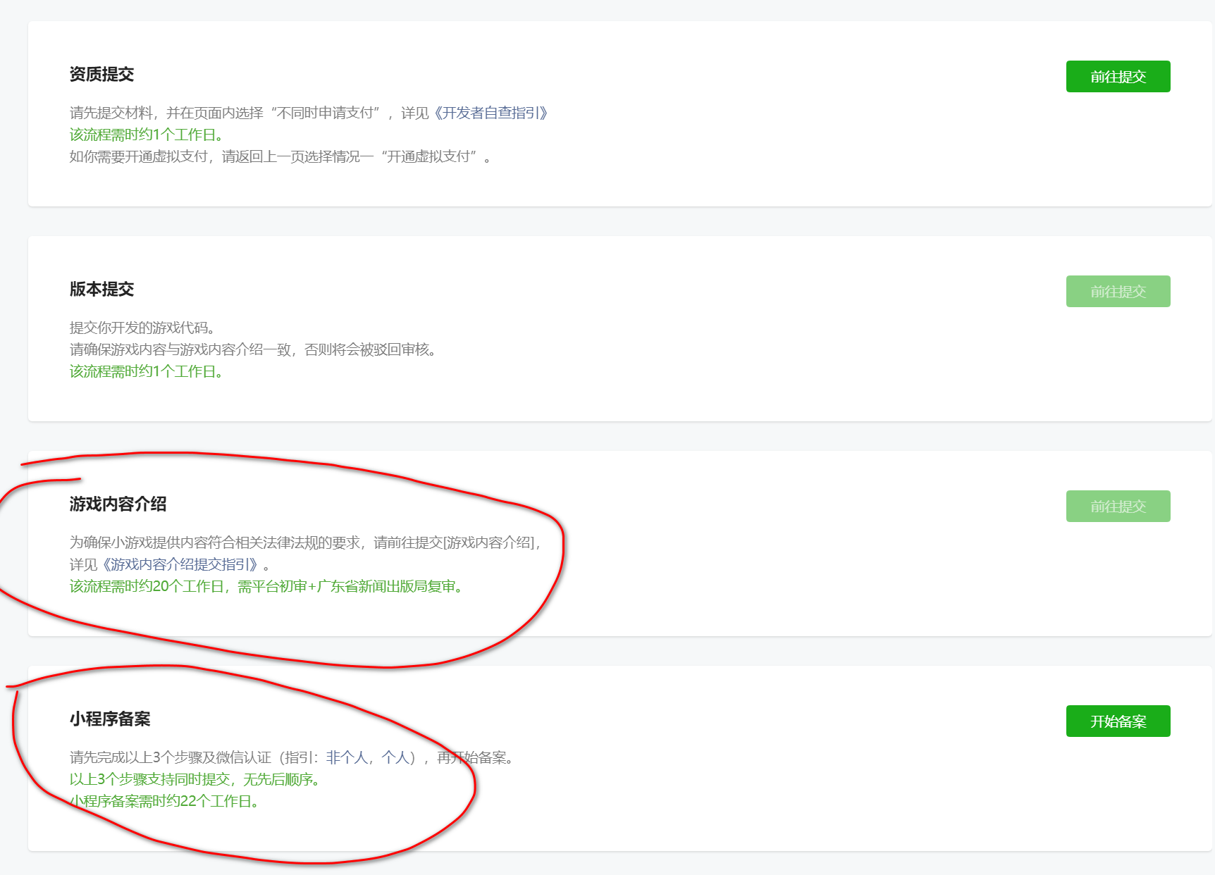 微信小游戏审核,“游戏内容介绍”和“小程序备案”需要的时间比较久,分别是 约20 和 约22个 工作日。