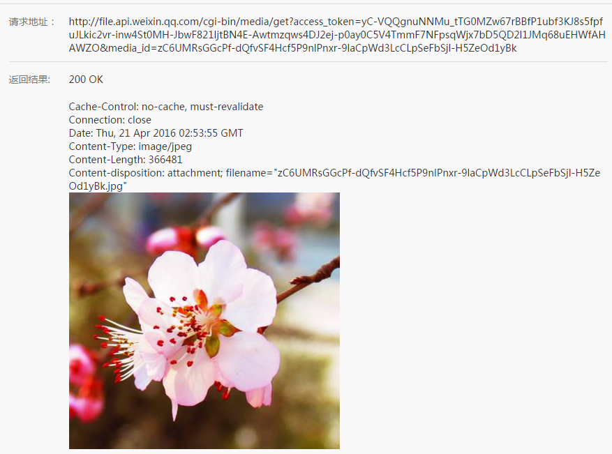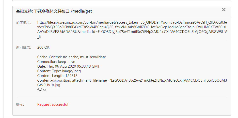 如图,这次请求的是成功的,但是微信后台返回给我的却不是图片是一个false,正常应该返回一张图片,如图二。这个有没有办法调试一下原因