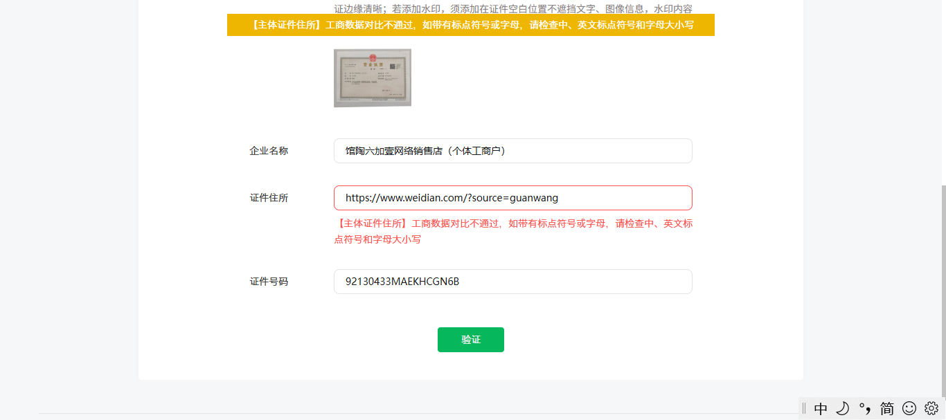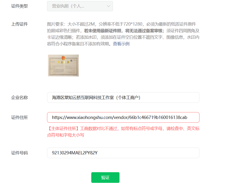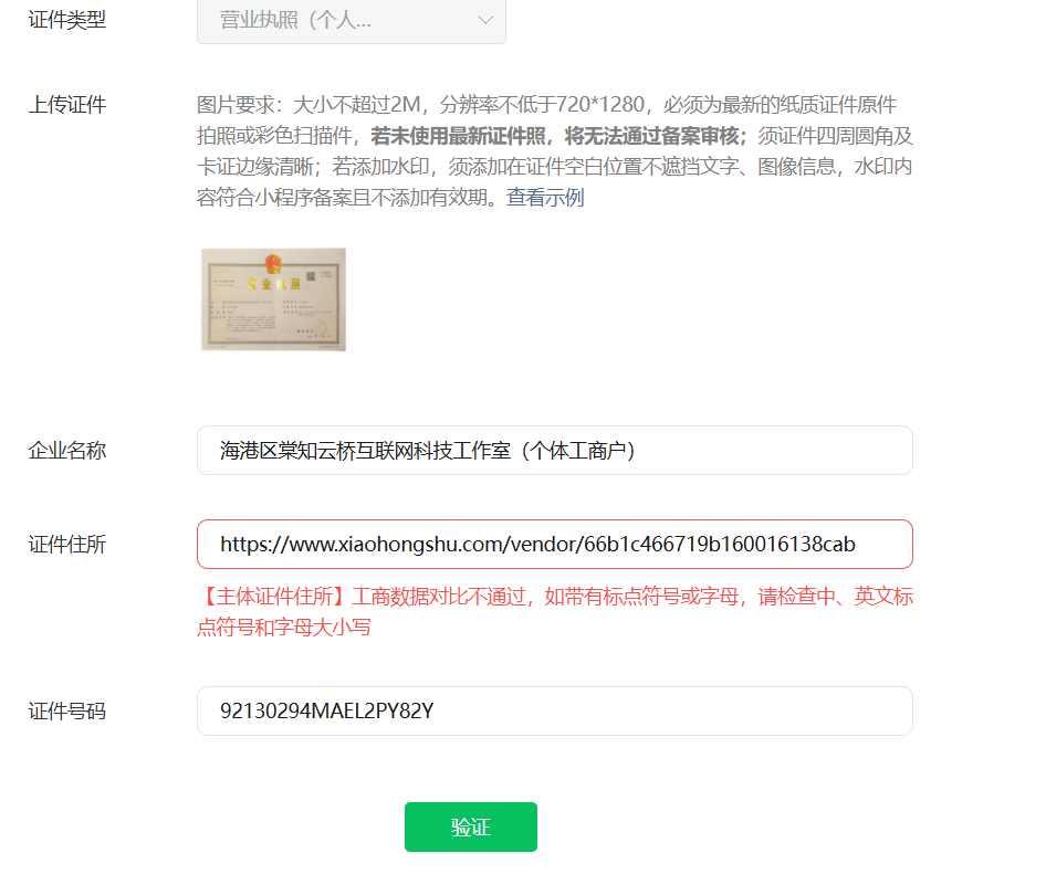 电子商务营业执照经营地址为网址,在提交备案时,提示工商比对不通过官方也没有文档说明小程序备案电商营业执照不能备案,而且要认证付钱后才能备案,认证费用也不能退,希望微信官方在这些情况都出具一下说明