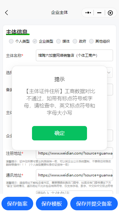 微信官方平台小程序备案时没有明确说明,电商网址无法作为“证件住所”地址,且提示"【主体证件住所】工商数据对比不通过,如带有标点符号或字母,请检查中、英文标点符号和字母大小写"无任何说明,且没有客服可以联系,实在很不合理,官方并没有任何明确的解决方案去提供给大家。@小程序运营专员-PZY