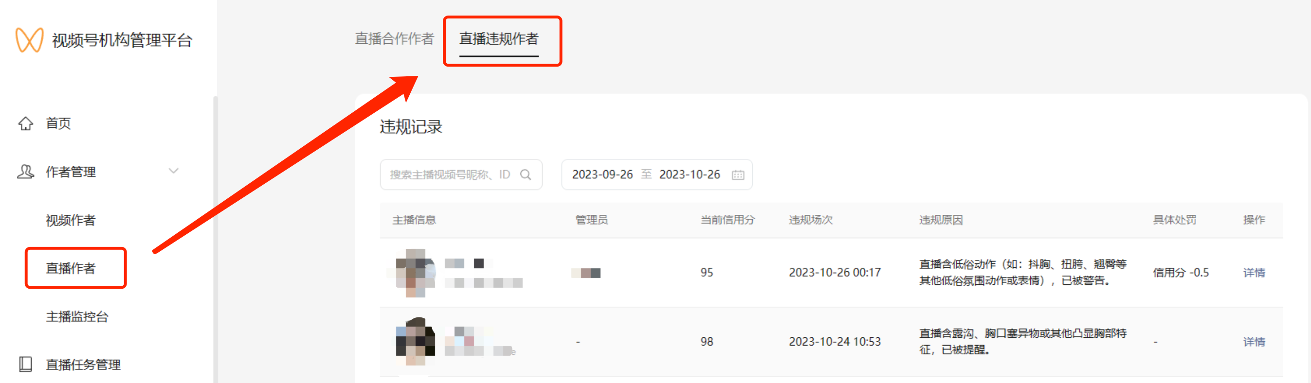 具体查看路径为:登录 https://channels.weixin.qq.com/mcn/login ——作者管理——直播作者——直播违规作者