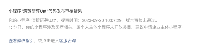 我们的小程序是办公类小程序,而且只能在企微环境下,供内部员工使用,并不对外开放以及提供医疗服务,我在审核备注里也注明了相关情况,可是却一直认定为需要开启医疗服务。