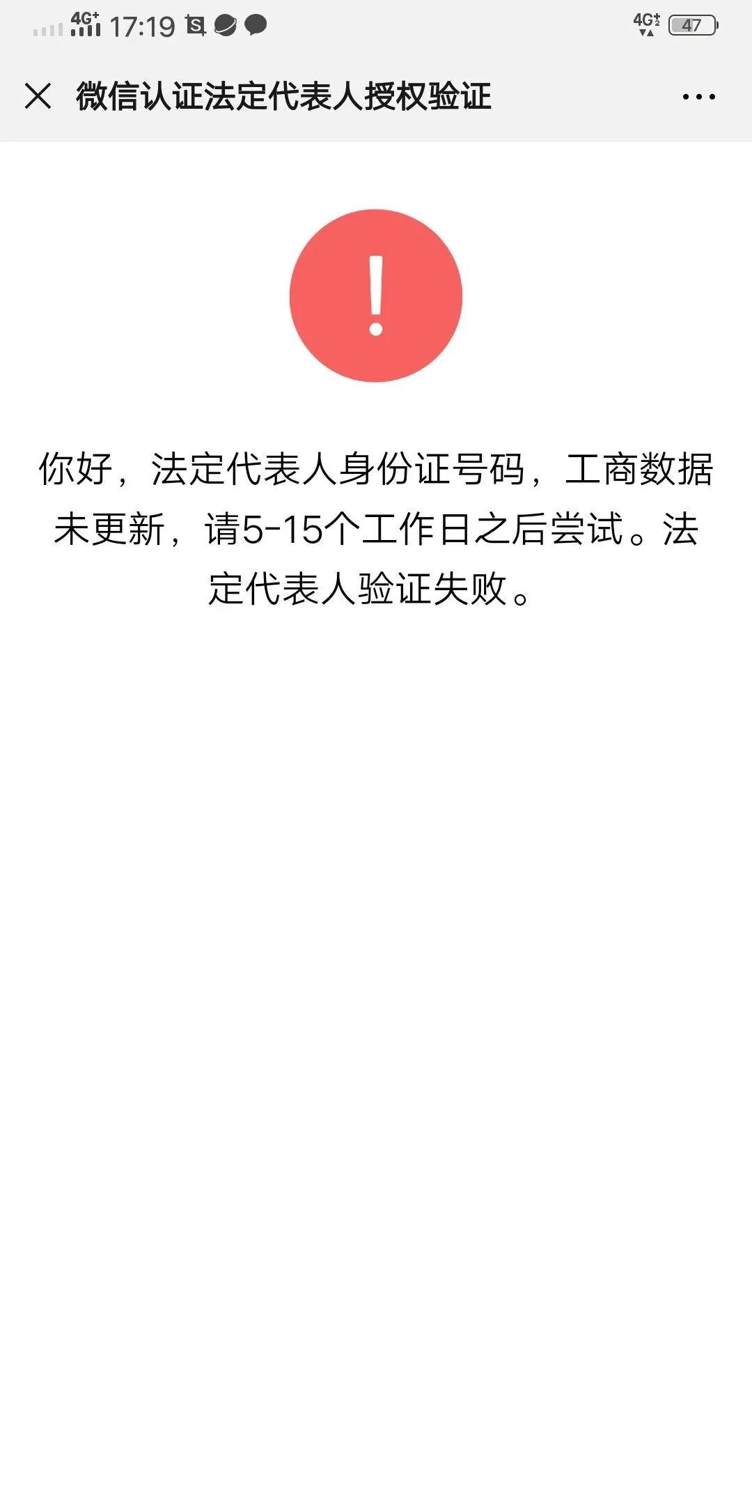 公众号id:gh_3ea6c34e7801;绑定邮箱2069247884@qq.com ;扫码法人微信号g18048777995 资料没问题,国家企业信用信息公示系统里也都可以查到这个营业执照,但是认证一直过不了。