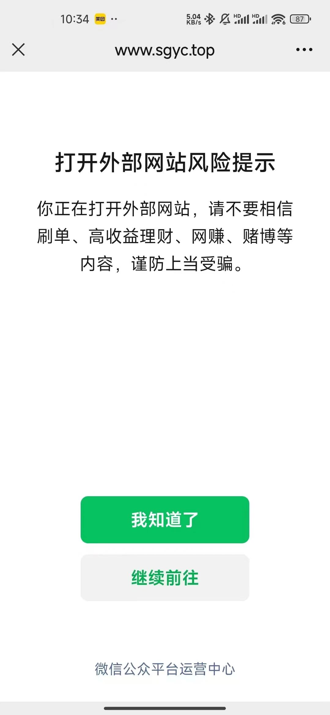 公众号挂外部系统打开提示这个,怎么取消这个提示,我们已经备案了,并且用的也是https