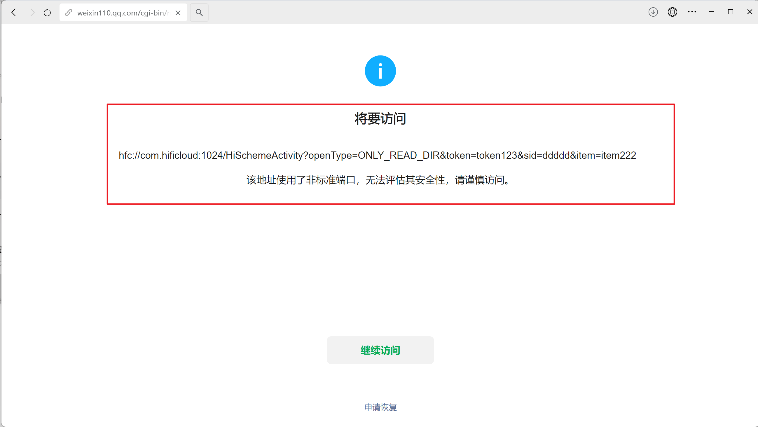 <!DOCTYPE html> <html lang="en"> <head> <meta charset="UTF-8" /> <meta name="viewport" content="width=device-width, initial-scale=1.0" /> <title>Document</title> </head> <body> <a class="myapp" href="hfc://com.myapp:1024/HiSchemeActivity?openType=ONLY_READ_DIR&token=token123&sid=ddddd&item=item222">hfc://com.myapp:1024/HiSchemeActivity?openType=ONLY_READ_DIR&token=token123&sid=ddddd&item=item222</a> <button id="open">打开</button> <script> document .querySelector("#open") .addEventListener("click", function (event) { event.preventDefault(); // 阻止默认行为 // 这里可以添加你调起应用程序的代码 document.querySelector('.myapp').click(); }); </script> </body> </html>目前微信上运行效果: