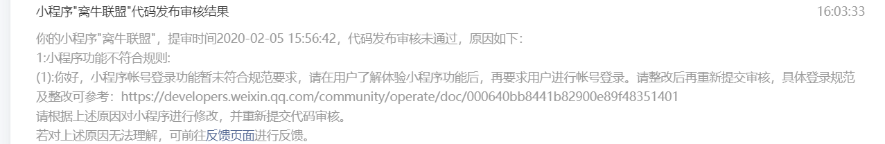 你好,小程序帐号登录功能暂未符合规范要求,请在首页补充说明使用帐号登录的原因,让用户了解具体服务功能后,再引导用户进行帐号注册或帐号登录。请整改后再重新提交审核,具体登录规范及整改可参考:https://developers.weixin.qq.com/community/operate/doc/000640bb8441b82900e89f48351401<