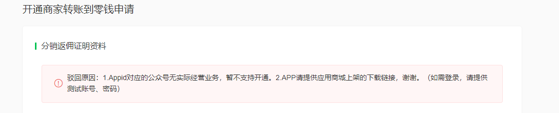 申请开通商家转账到零钱被驳回:Appid对应的公众号无实际经营业务,暂不支持开通,这种应该怎么改?