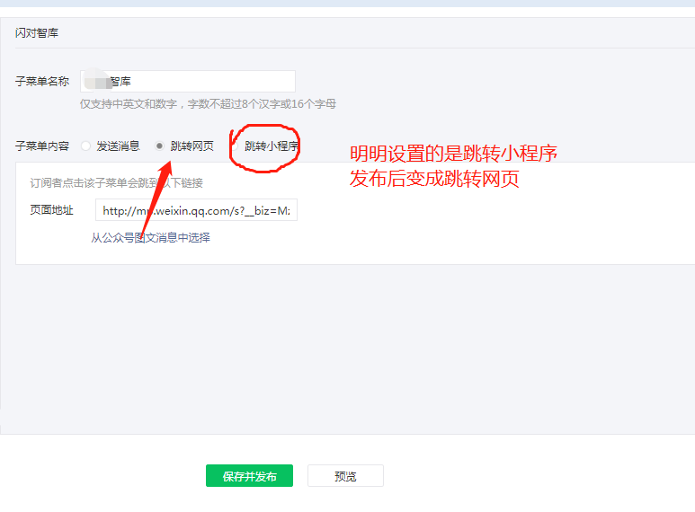 大家好,我是亓,不止大家有没有遇到过这样的问题,就是在公众号菜单栏设置跳转小程序的时候,点击发布,然后就变成跳转公众号网页,如图: