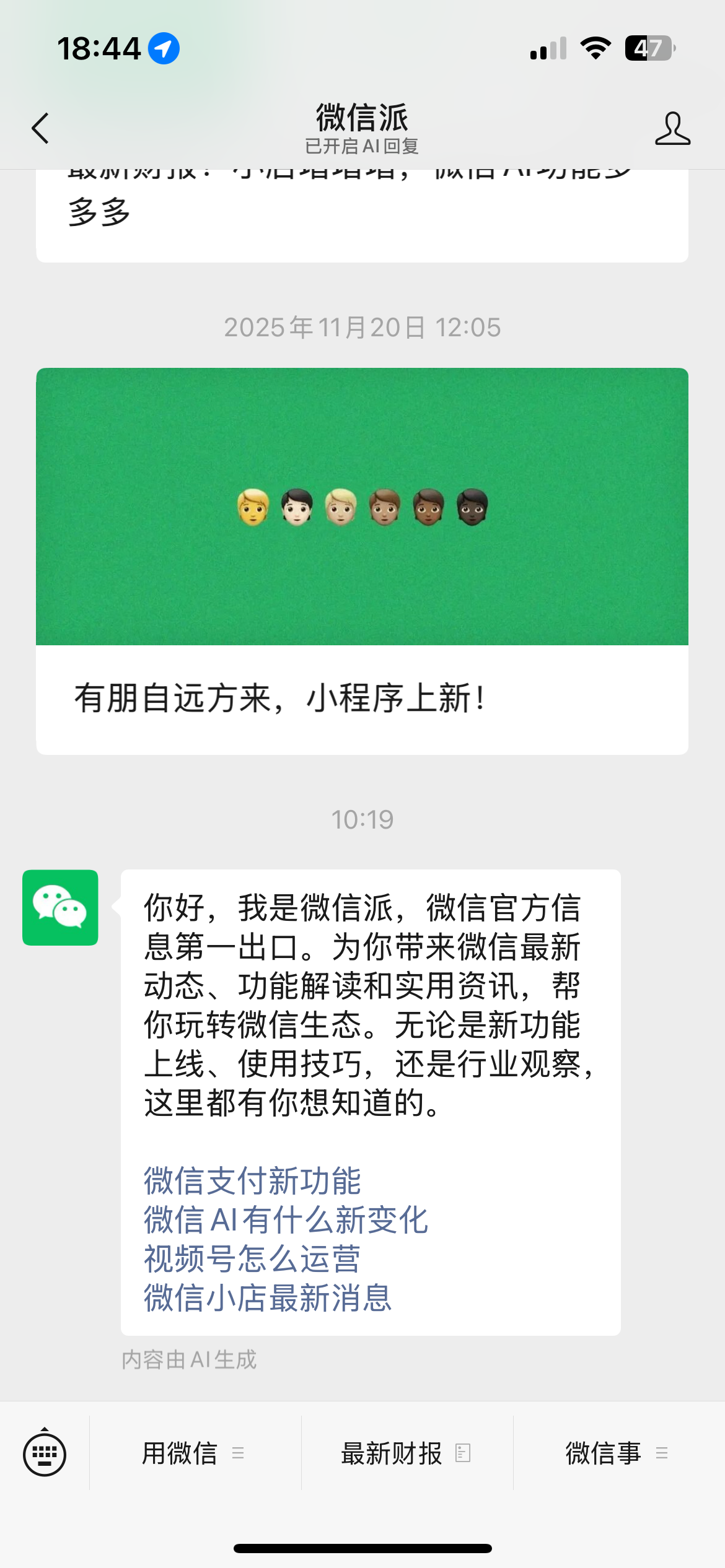 自己微信收不到多个微信公众号对话框推送的文章,只能在历史记录里面看到,自己看自己的公众号也看不到内容,已经测试,非黑名单,全员推送,跟多个运营者交流均有此问题,微信派的文章都看不到。