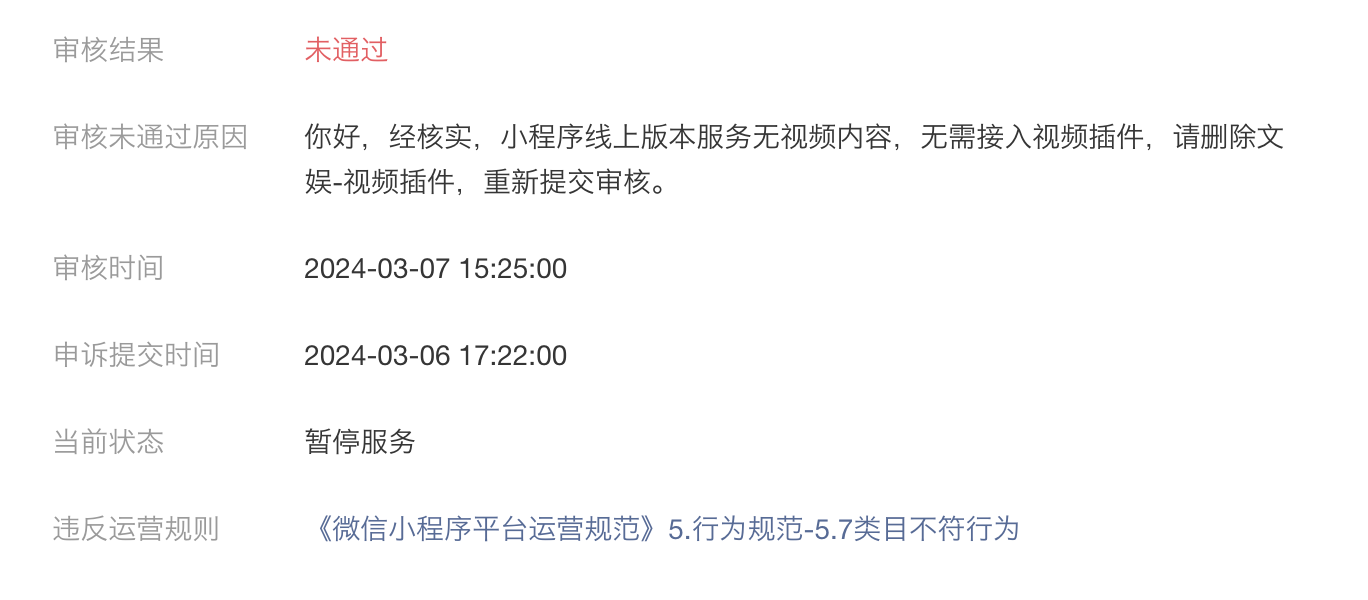 中间做了五次申诉,每次审核未通过原因都一样,但第一次审批就进行了视频插件的删除。望腾讯审核的大哥大姐,以及小哥,小姐姐们明察啊~~o(╥﹏╥)o