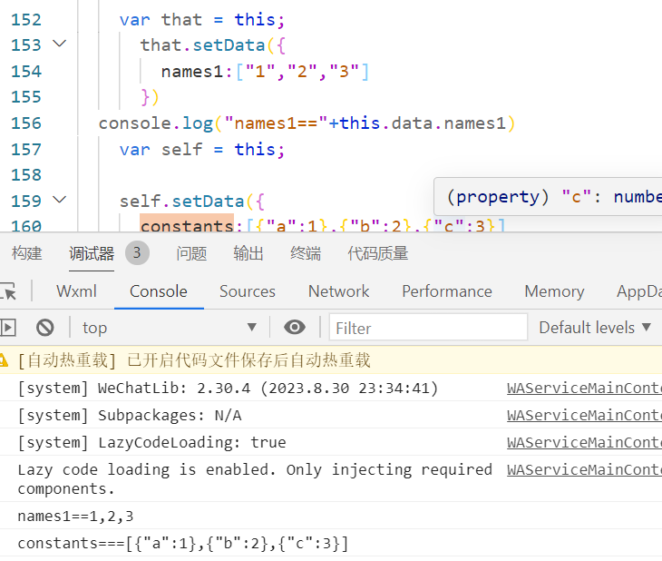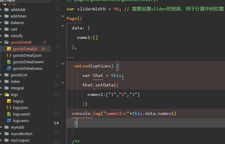 data: {name1:[]},...onLoad(options) {var that = this;that.setData({names1:["1","2","3"]})console.log("names1=="+this.data.names1)}