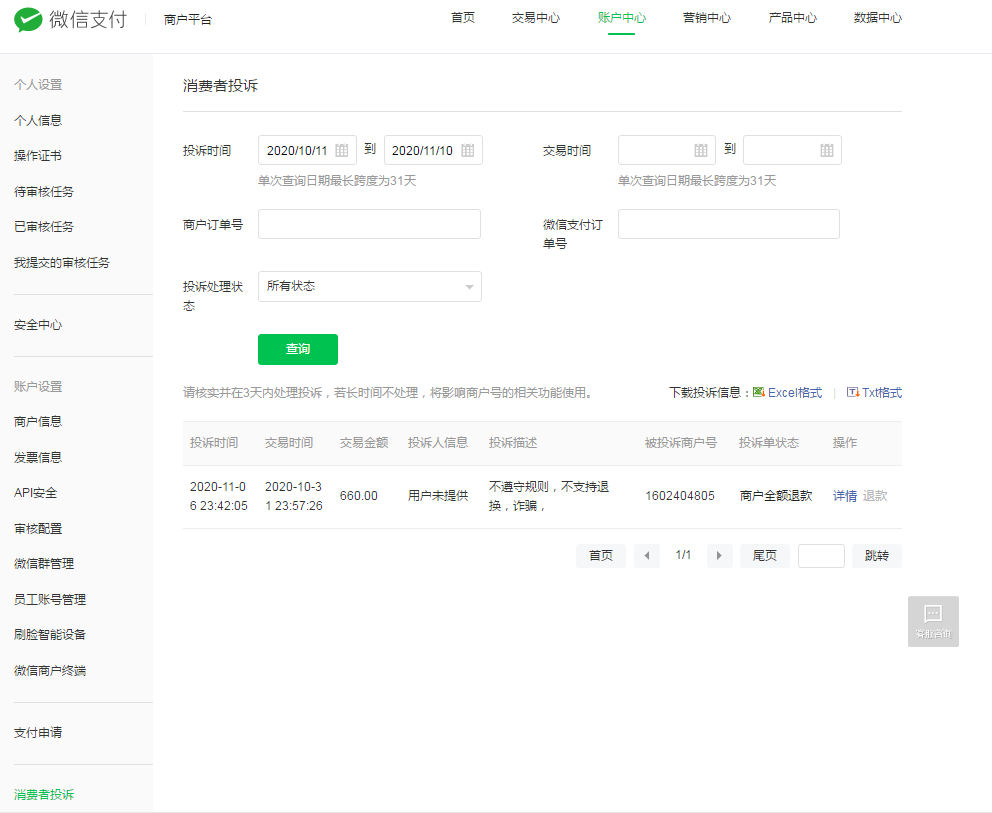商户号:1602404805 之前有过一个消费者投诉,第二天他就主动撤销了投诉,也已经全额退款了,但是其他用户付款时还是会有风险提示,请求微信官方解除下风险吧,拜托了。。。麻烦也说下,这个风险什么时候会消除啊?很急。。