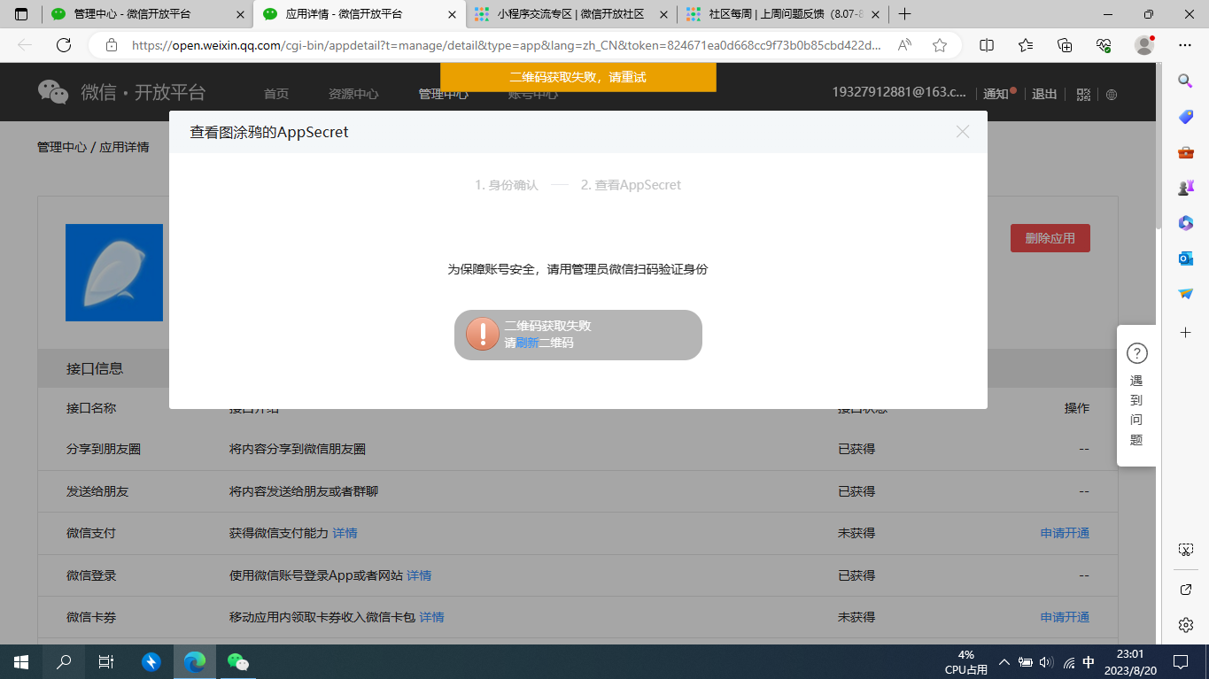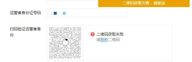 当公众平台运营者扫码提示“二维码获取失败,请重试“,请检查运营者的身份证姓名、身份证号码等信息是否全都填写完整,如果没有请填写完整了之后再重新操作扫码,如果信息已经填写完整,但是还是提示“二维码获取失败”的话,请尝试换个浏览器重试即可。如下示例图:
