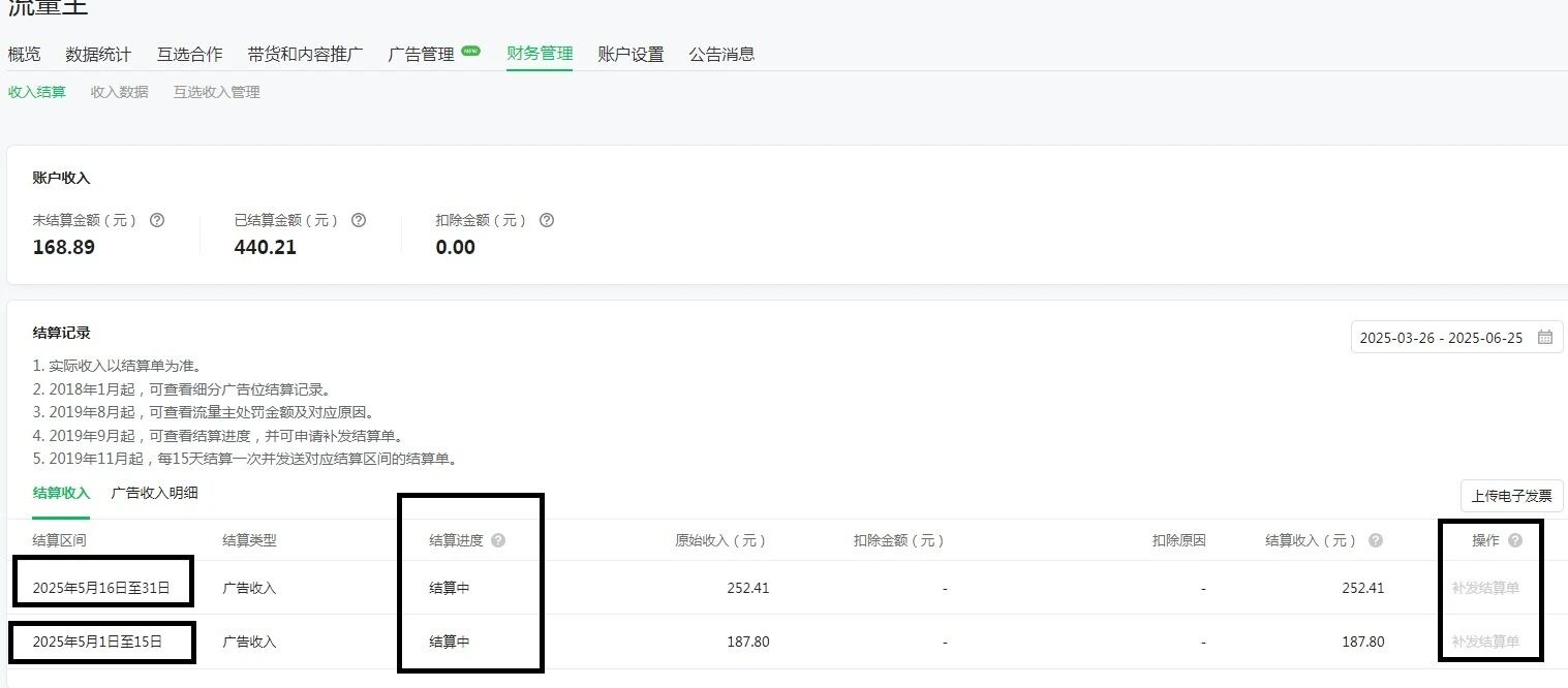 公众号广告流量收入一直显示“结算中” 后面的操作栏中显示“ 补发结算清单”,第一笔收入一个月了还未入账,这是什么原因?