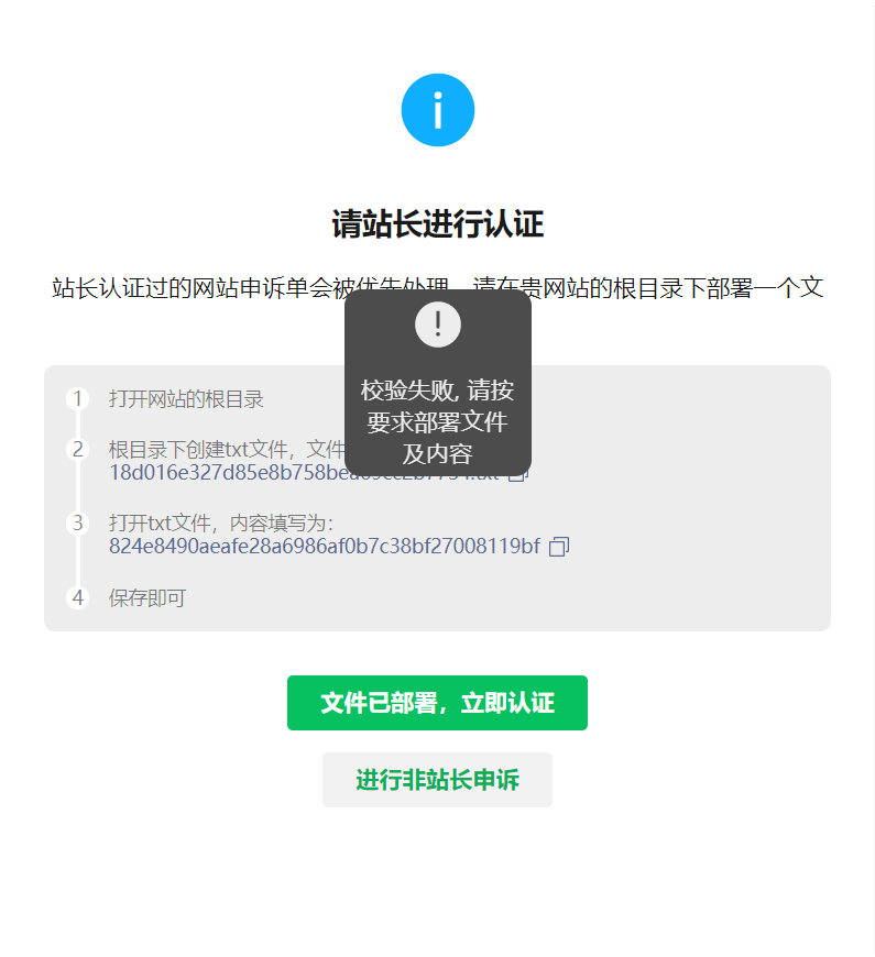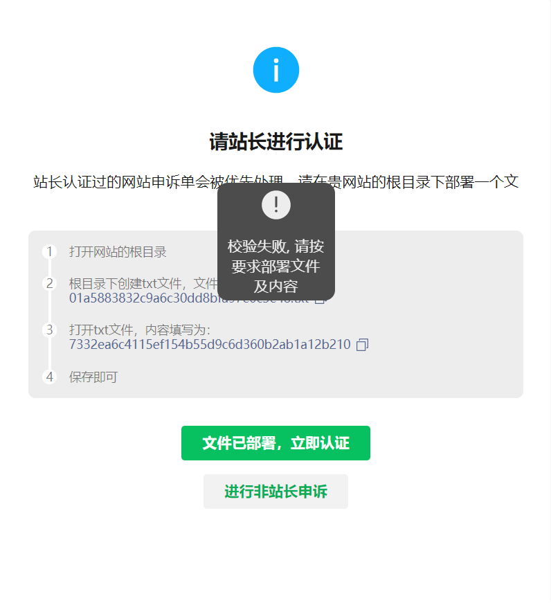 站长认证失败,我已经部署过要求的文件,但是在微信一直提示校验失败?