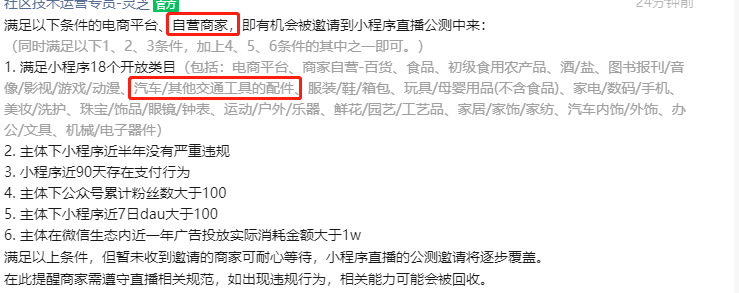 满足以下条件的电商平台、自营商家,即有机会被邀请到小程序直播公测中来: