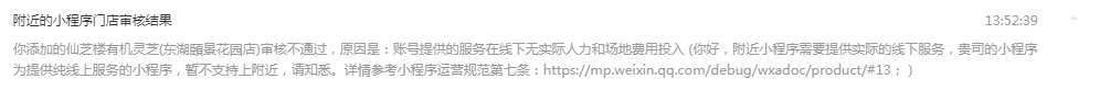 你好,贵司的小程序账号审核不通过原因是小程序的内容没有包含线下门店服务。附近小程序的小程序内容需要包含实际的线下门店服务,可通过小程序类型:小程序的内容需含包含线下门店服务,如提供外送、预约、点餐、优惠、会员、买单、排队、购票、点餐、快递、充电、缴费、乘车、挂号等服务;贵司的小程序提供的是纯线上展示以及销售产品的服务,小程序内容没有提供线下门店服务,暂时不支持上附近,建议调整小程序内容以包含线下服务后重新提交审核;详情参考小程序运营规范第七条:https://mp.weixin.qq.com/debug/wxadoc/product/#13;以及《附近的小程序使用指南》:http://kf.qq.com/faq/170401MbUnim17040122m2qY.html