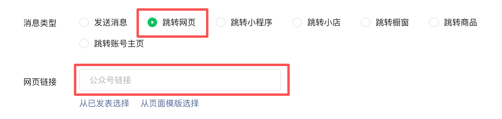 若你的公众号是非个人主体且完成微信认证,可以在【跳转网页】中添加外链地址进行跳转。(可忽略输入框的「公众号链接」提示,直接输入外部链接保存。)