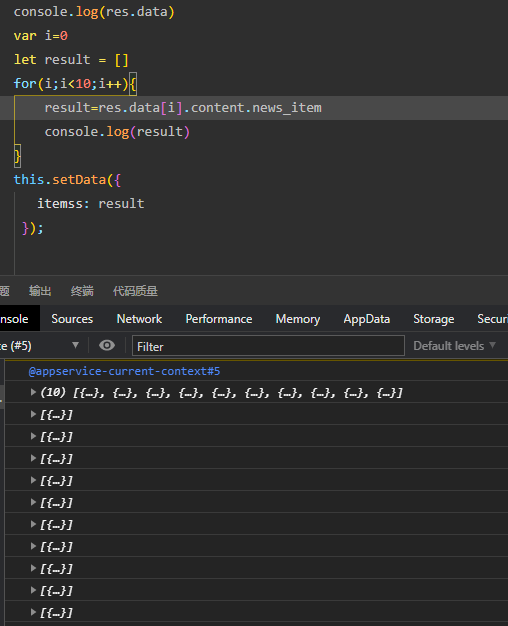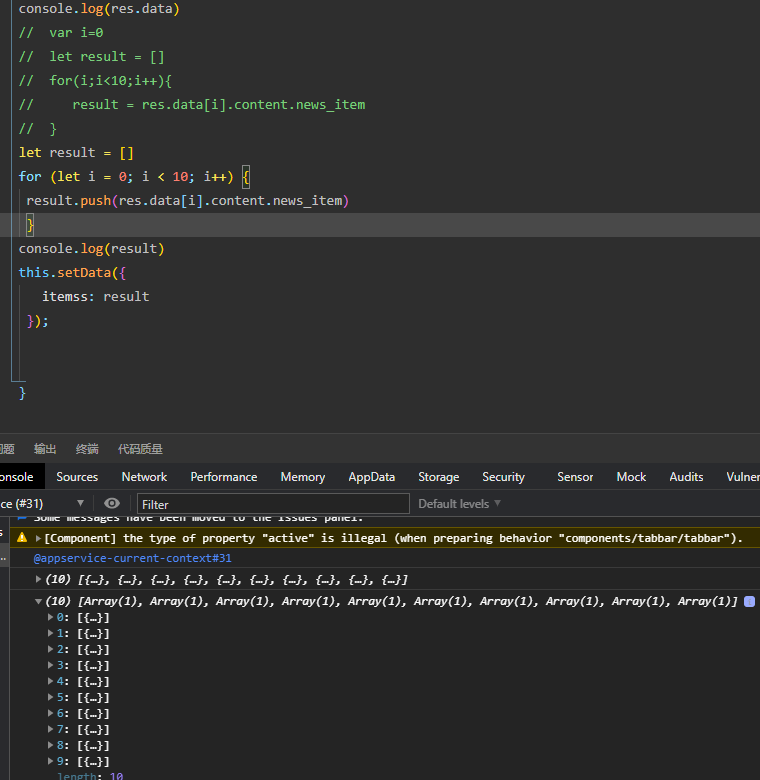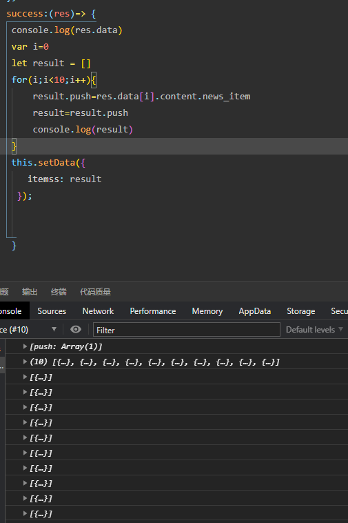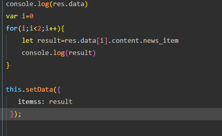 let result = []for (let i = 0; i < 10; i++) {result.push(res.data[i].content.news_item)}this.setData({itemss: result})在for循环外部定义result