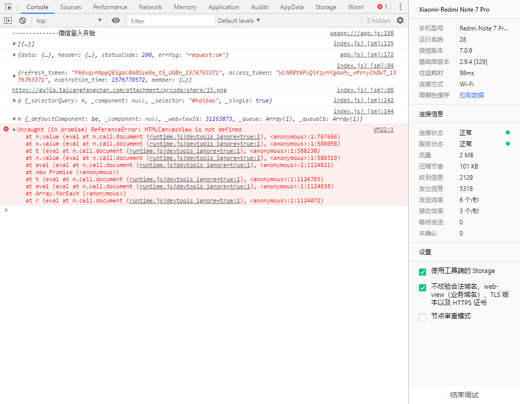 再开发工具上可以运行,没错误信息,再真机调试就报错误了