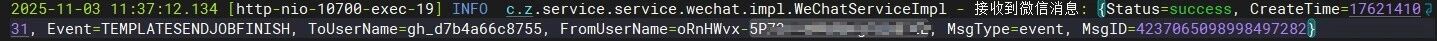 2025-11-03 09:39:44.806 [http-nio-10700-exec-30] INFO c.z.service.service.wechat.impl.WeChatServiceImpl - 接收到微信消息: {Status=success, CreateTime=1762133980, Event=TEMPLATESENDJOBFINISH, ToUserName=66c8755, FromUserName=73StJWm50PgkOlVLZE, MsgType=event, MsgID=4236946792496939011}
