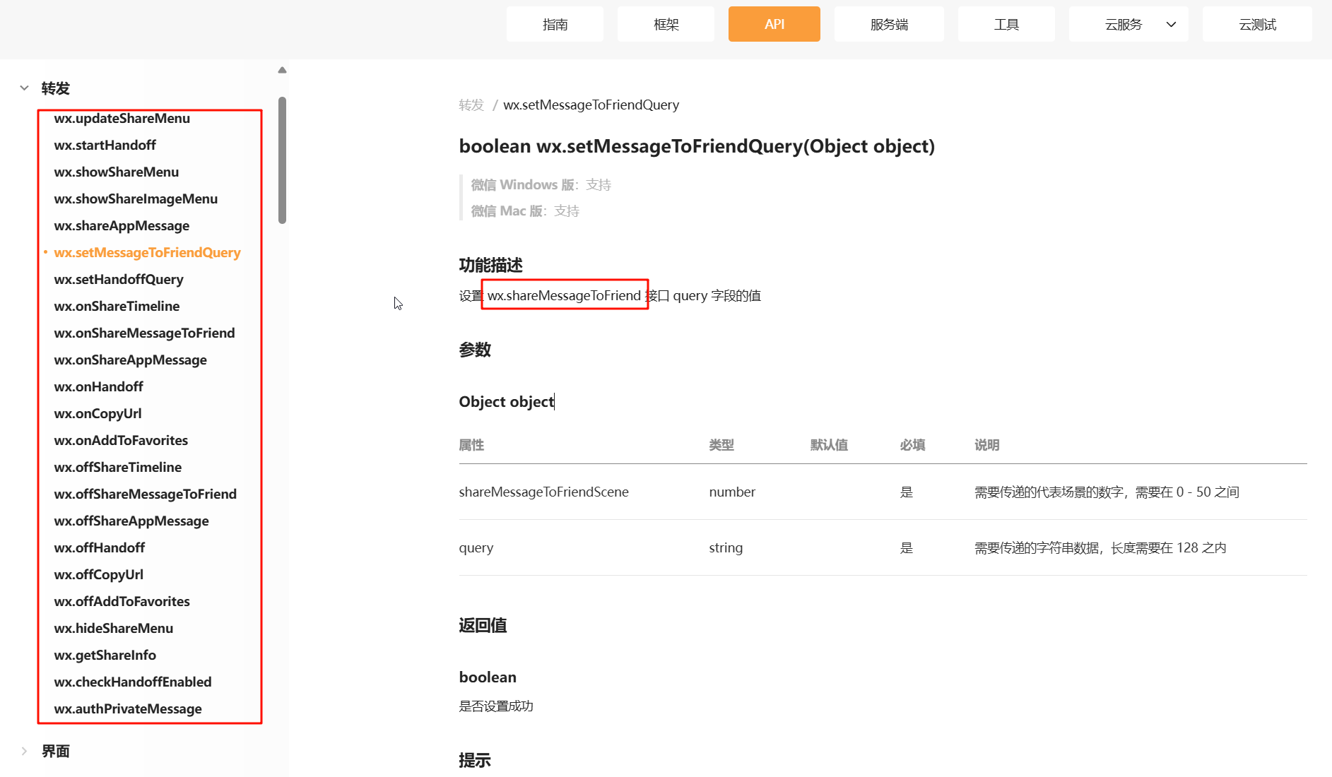 来你自己来在左边找一找你有没有一个叫做wx.shareMessageToFriend的api,我只能猜他是设置wx.shareAppMessage 这个接口的query字段的,你们文档没人检查的吗?