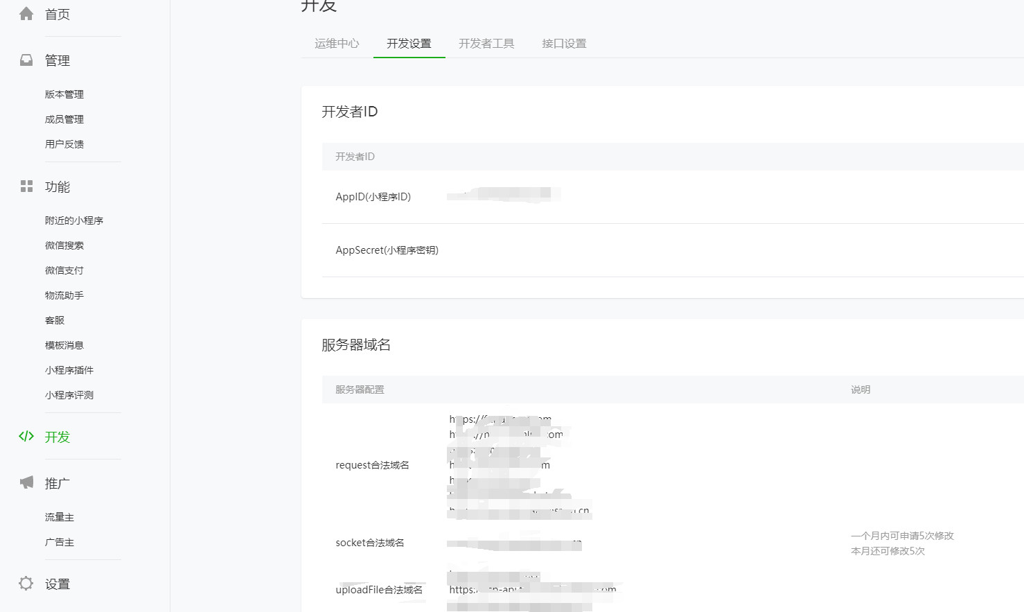 在代码中,为授权的小程序设置 域名。 【request uploadFile downloadFile web-view业务域名】 都设置成功了, 就是socket 没有值。