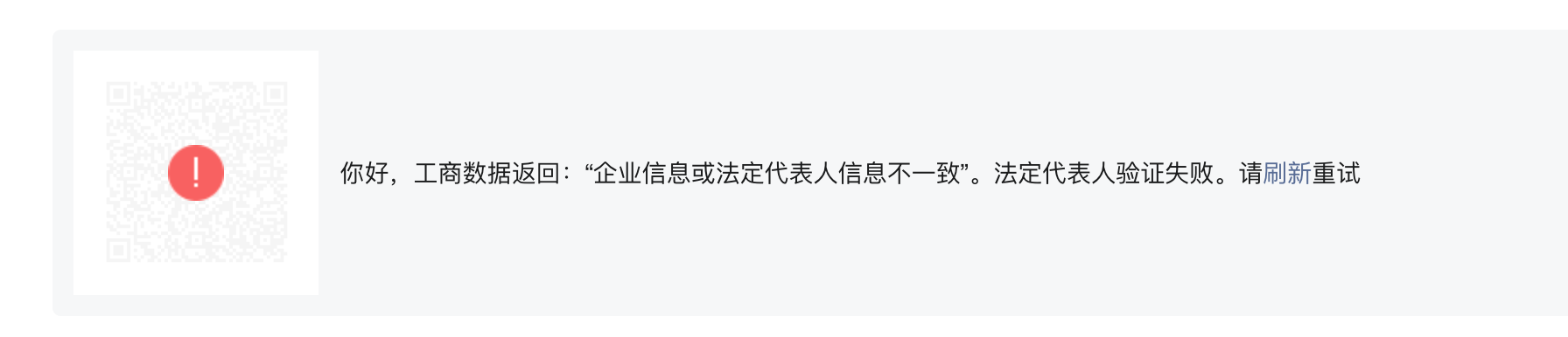 你好,工商数据返回:“企业信息或法定代表人信息不一致”。法定代表人验证失败。请刷新重试