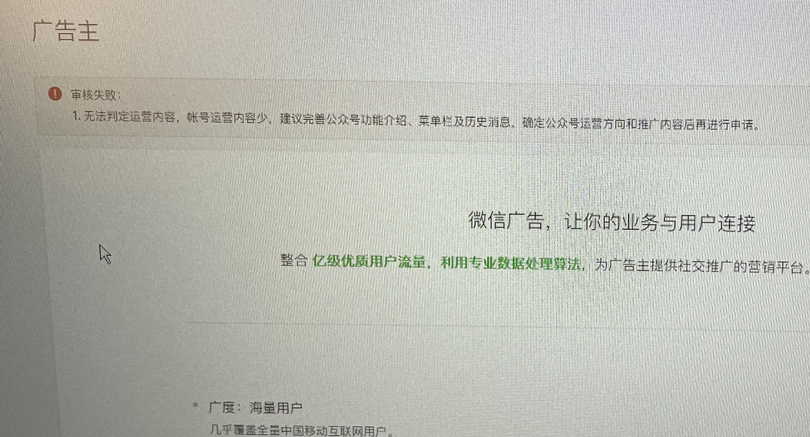 急!最近公司需投放朋友圈广告,之前充值还剩余将近10000元广告费没使用,今天点开广告主,我的天!啥都没了,居然还要重新开通,那之前账户的余额哪里去了?是不是要再次开通了之前余额才能显示?于是赶紧申请了开通,结果审核失败,失败的原因完全看不懂,我们账号都运营5年多了,文章发了几百条,如下图片所示,请技术人员看到,尽快回复我,谢谢!