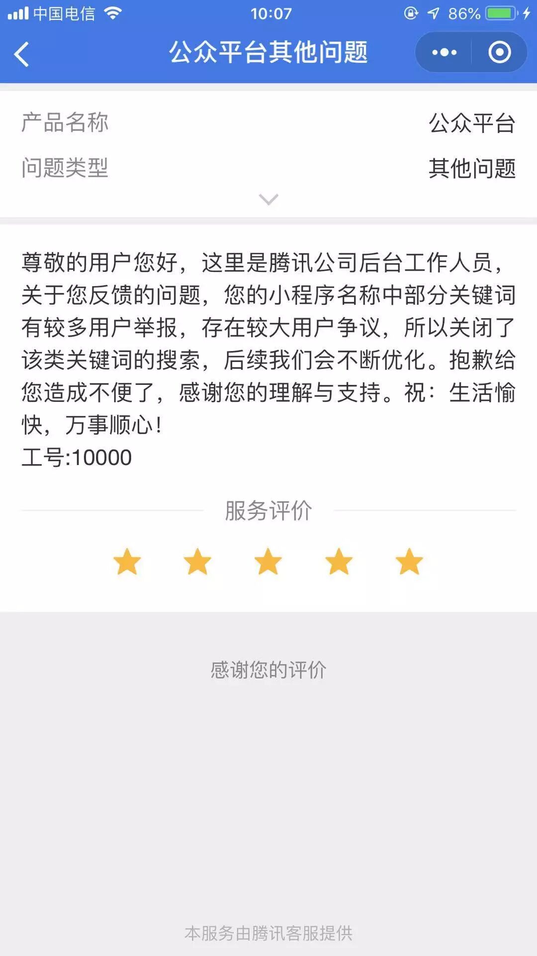 明摆着在侵犯我们的权益,小程序名称是腾讯认证才取得,再未违反规范的前提下毫无声明的剥夺了搜索权。就像给人准生证人家合法生了孩子,含辛茹苦养大了说孩子要处死,例子难听但是同理。我们消耗的时间,金钱,精神损失谁来赔偿。我会继续跟他们磕,简直是无赖公司,连个直达的专区人工客服都没!