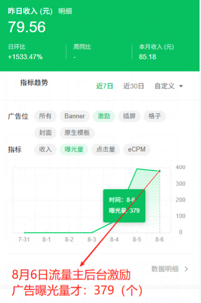 流量主后台激励广告曝光量是:379(个),我的后台监控广告播放完成量是:1605(个),少了4倍多;