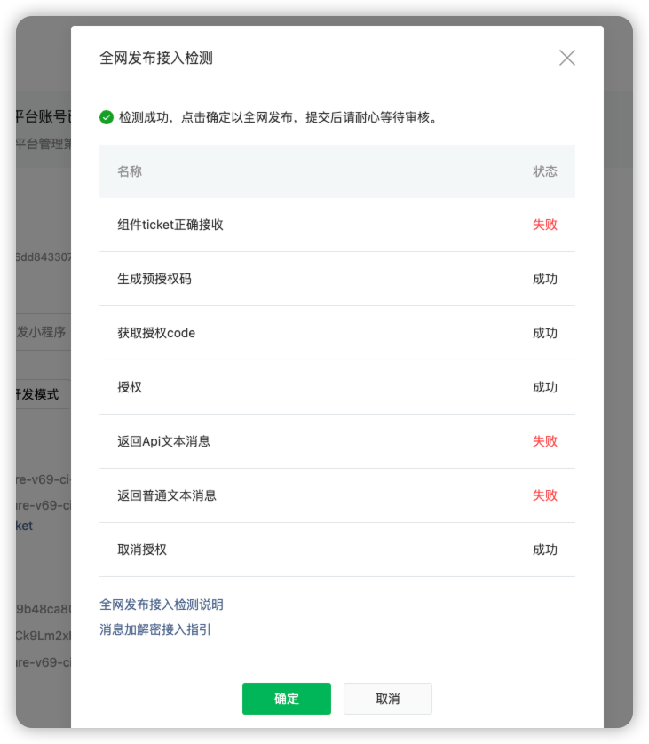 2、文本消息检测失败问题,请严格按照文档步骤执行https://developers.weixin.qq.com/doc/oplatform/Third-party_Platforms/2.0/operation/thirdparty/releases_instructions.html