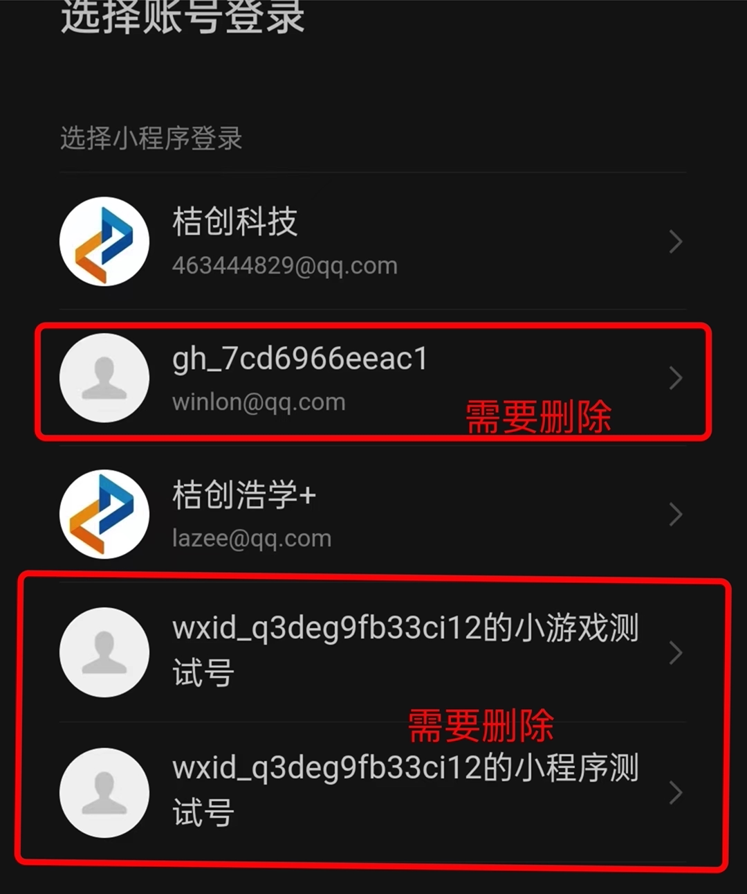 在这个页面,点那两个测试号, 进入新页面,底部有个解绑,