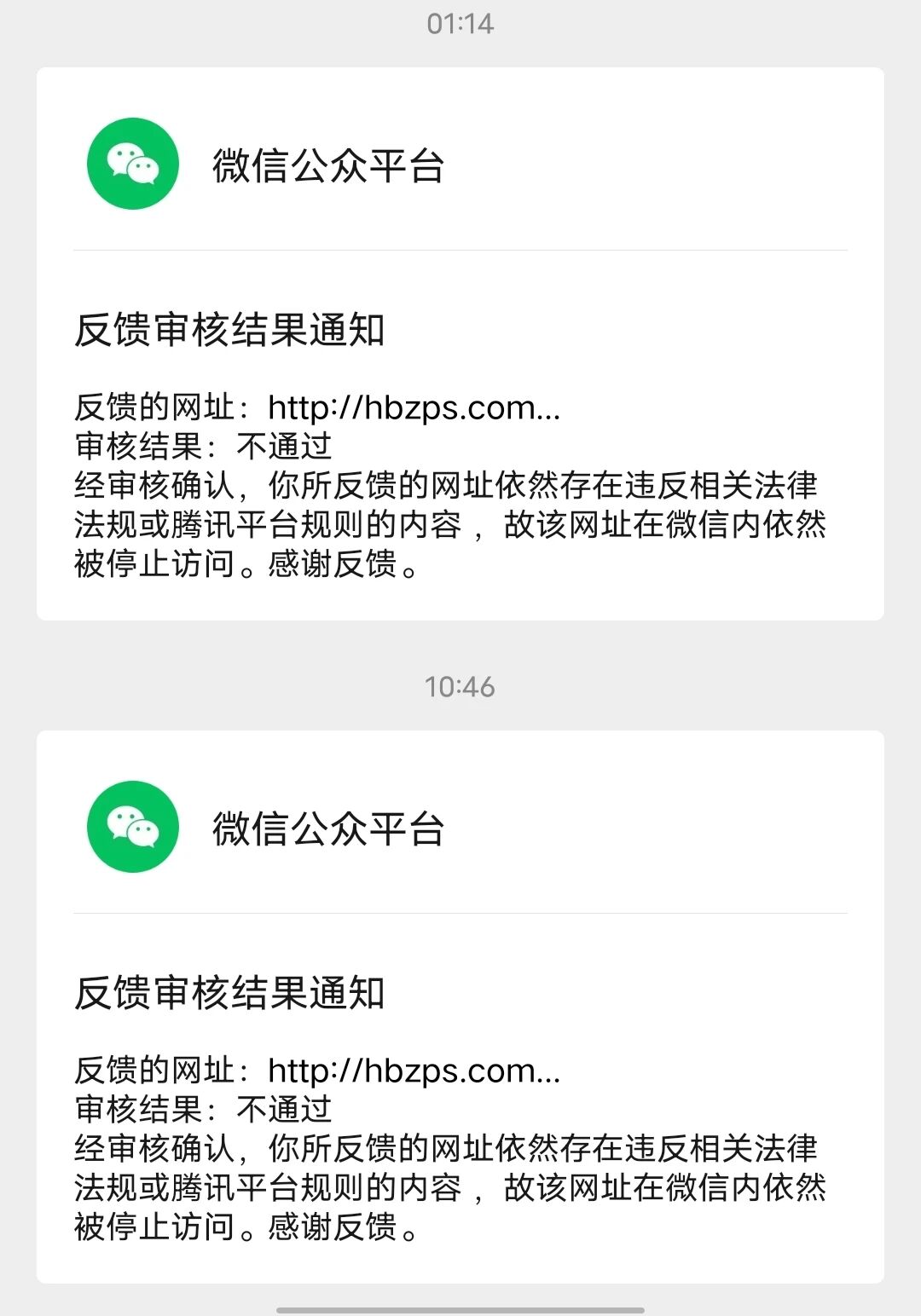 hbzps.com网站域名2021年6月2日通过腾讯云新注册域名,2021年6月11日通过的ICP备案(冀ICP备2021013138号),2021年6月16日通过的全国互联网公安备案;网站自搭建以来一直都没有做违规以及诱导关注和分享,自从发现网站无法在微信正常访问后多次通过微信提交申请恢复始终被驳回,希望工作人员给予解封!