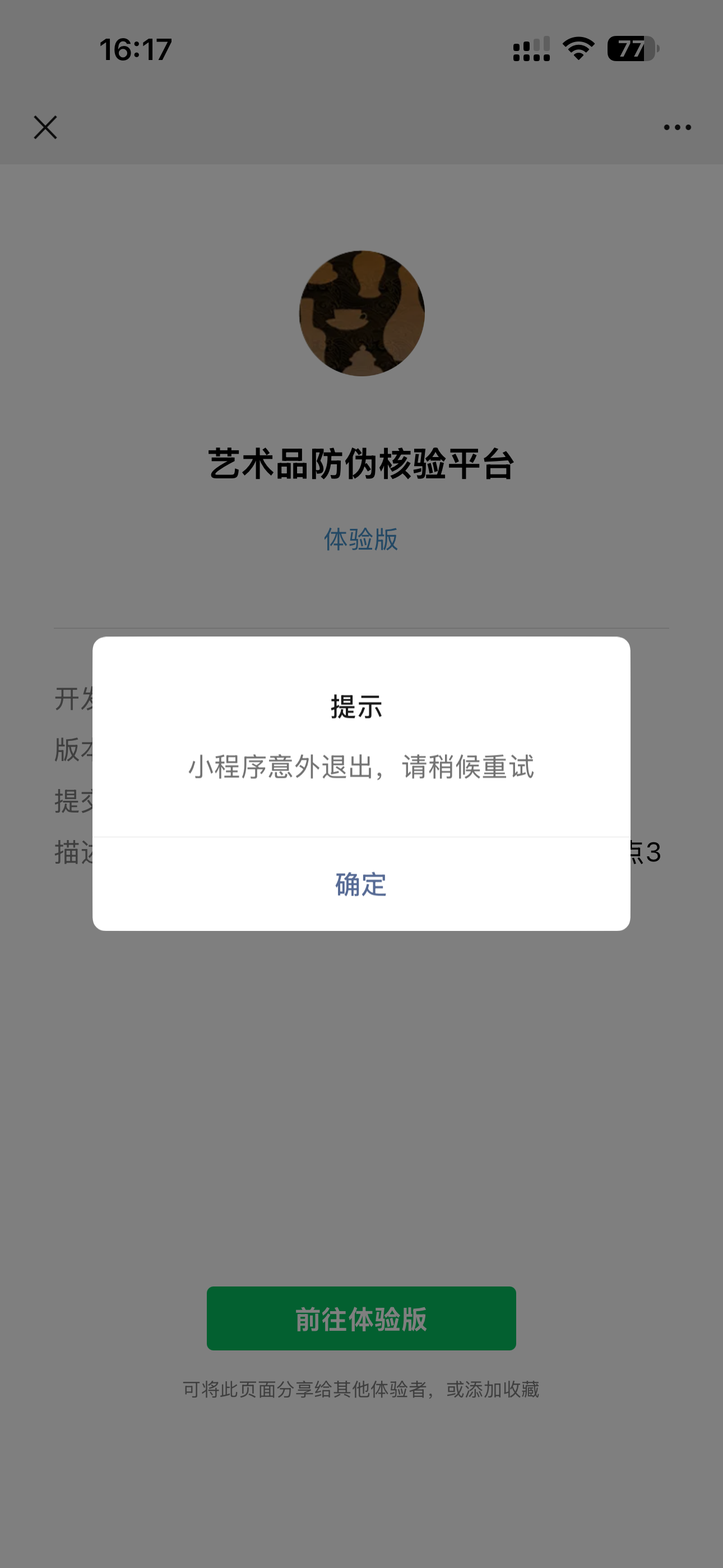 公众号平台,微信扫描 体验版 二维码,点击前往体验版,提示 小程序意外退出,请稍后重试