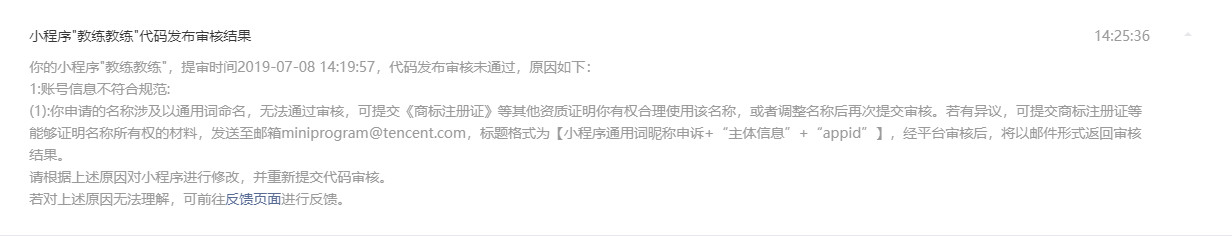 你好,经核实,贵方申请的名称涉及以通用词命名,无法通过审核,可提交《商标注册证》等其他资质证明你有权合理使用该名称,或者调整名称后再次提交审核。若有异议,可提交商标注册证等能够证明名称所有权的材料,发送至邮箱miniprogram@tencent.com,标题格式为【小程序通用词昵称申诉+“主体信息”+“appid”】,经平台审核后,将以邮件形式返回审核结果。命名规则可参考:https://developers.weixin.qq.com/community/develop/doc/0006e8a6e28a38c6ef88db7f051401?jumpto=comment&commentid=0004c04f2f866817e8884bcf6514