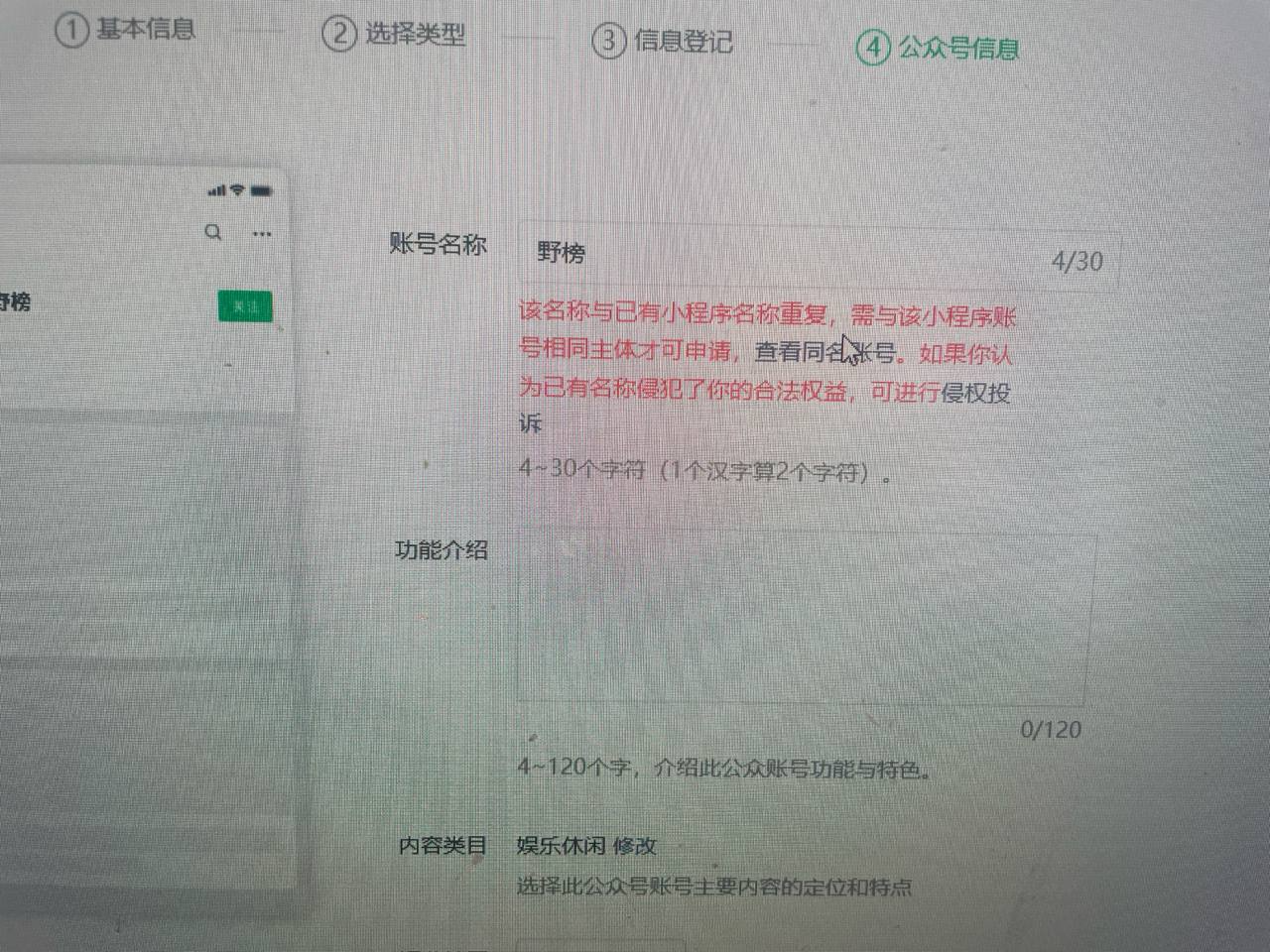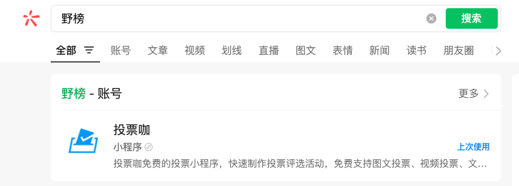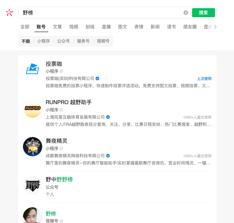 如上图显示,在搜索栏输入“野榜”,检索结果没有显示同名的账号,“投票咖”小程序的相关信息和野榜没有任何关联。为什么在注册的时候,就显示有同名的小程序?以及在前端检索的时候,显示如图3出现“野榜-账号”是否意味着有同名的小程序/公众号