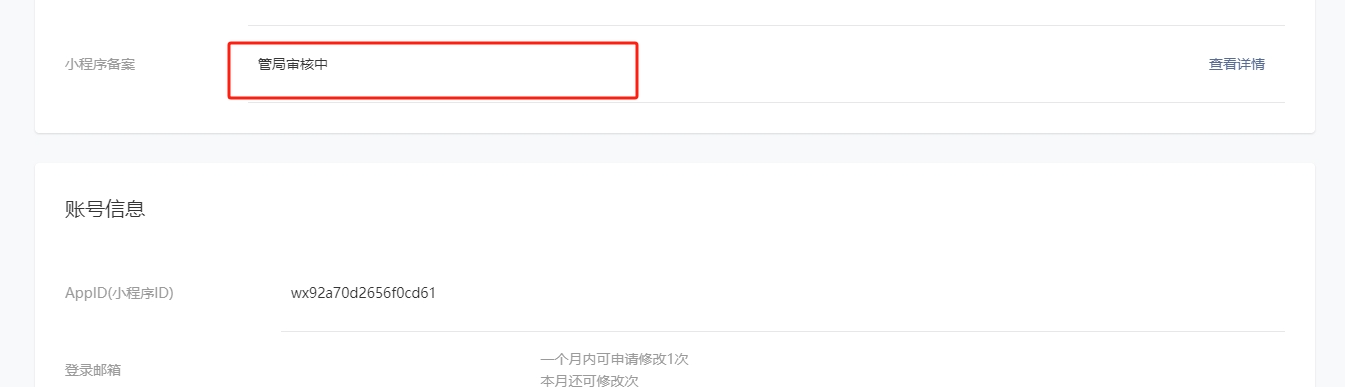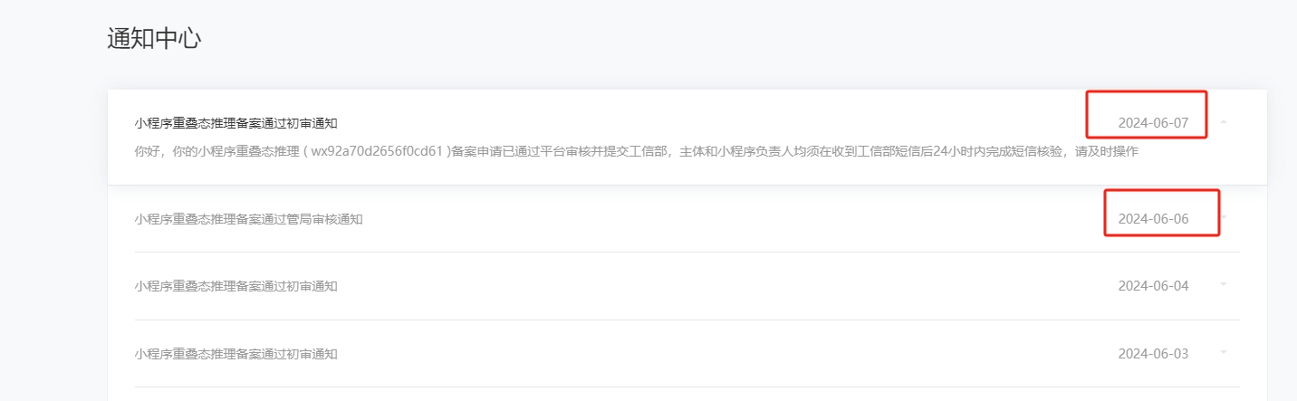 小程序:(appid:wxc398384c5846f1f5),收到短信显示备案通过有备案号,但是小程序页面还是管局审核,麻烦更新状态,已经两天了!
