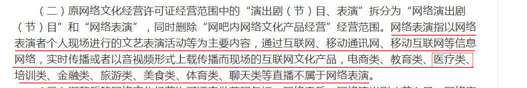 我司需要增加视频播放功能,但在申请《网络文化经营许可证》时,被告 医疗类的实时传播或者以音视频形式上载传播而现场的互联网文化产品不属于网络表演,导致经营许可证申请失败,政策如图: