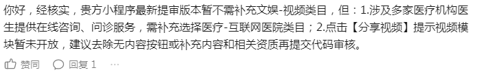 2.你好,经核实,贵方小程序确实涉及多家医疗机构医生提供在线咨询服务,是需要补充选择医疗-互联网医院类目的