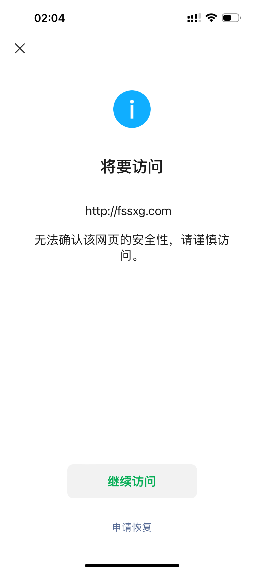 您好,域名(fssxg.com),普通的企业展示型网站,已经正常运营一年多近期出现访问问题,域名在腾讯注册,服务器在香港无法备案,SSL证书正常(近期更新),浏览器访问正常,我是网站开发者,微信号:lqu0060,访问时间如图2024/5/14,微信访问网站出现“无法确认该网页的安全性,请谨慎访问”,经检查网页里没有不安全的内容,请核实后帮忙解除拦截,谢谢!