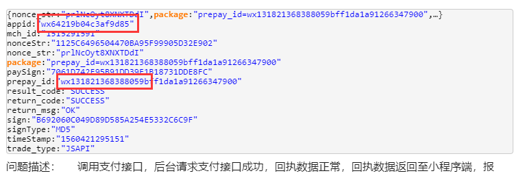 问题描述: 调用支付接口,后台请求支付接口成功,回执数据正常,回执数据返回至小程序端,报错“商户传入的appid参数不正确,请联系商户处理”,没有弹出输入密码页面!!!